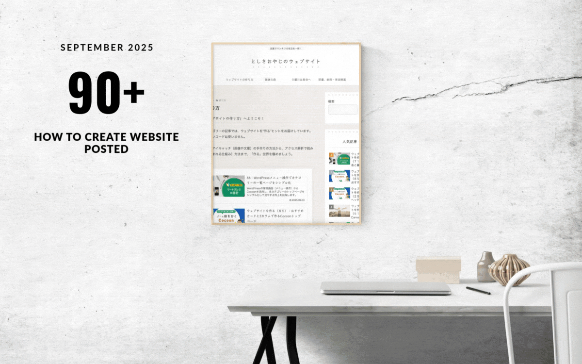 トップページ 2025.08.292025.09.08 Slider_CreateWebsite-2025-09Slider_HealthForest-2025-09Slider_SundayAtChurch-2025-09Slider_ReadingWatchingListening-2025-09 トピック・ハイライト(更新チェック!) 新着記事 お出かけ朝散歩(国内):岡山駅から徒歩で岡山城へ!帰りは路面電車と果実菓子を楽しむ 2025.10.06 日曜日は教会へ:夏日の名残りと信仰の歩み ― 礼拝・防災訓練・ぎっくり腰の午後 2025.10.05 読書:高野聖 2025.10.04 旅:たびレジ&Visit Japan Webで海外旅の準備を完了 2025.09.29 日曜日は教会へ:秋を感じた朝と旅路の恵み 2025.09.28 人気記事 ウェブサイトを作る(71):表と裏の顔?WordPressでの抜粋とメタディスクリプションの違い 2025.07.232025.08.01 1:無料で!? 2025.03.162025.10.02 8:ディスクの使用量とバックアップ 2025.03.282025.10.03 7:ワードプレスの初期画面と更新 2025.03.272025.10.03 ウェブサイトを作る(33):Squooshした写真をアイキャッチ画像に 2025.05.152025.06.25 更新記事 お出かけ朝散歩(国内):岡山駅から徒歩で岡山城へ!帰りは路面電車と果実菓子を楽しむ 2025.10.06 日曜日は教会へ:夏日の名残りと信仰の歩み ― 礼拝・防災訓練・ぎっくり腰の午後 2025.10.05 読書:高野聖 2025.10.04 8:ディスクの使用量とバックアップ 2025.03.282025.10.03 7:ワードプレスの初期画面と更新 2025.03.272025.10.03 ウェブサイト「作り方」一覧ページへ