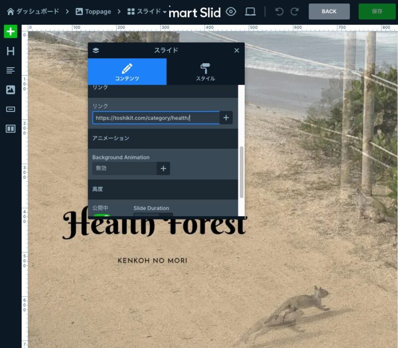- 左ナビゲーション下にある Smart Slider の「ダッシュボード」から、作成済みのプロジェクト(私の場合は Toppage)を開く。