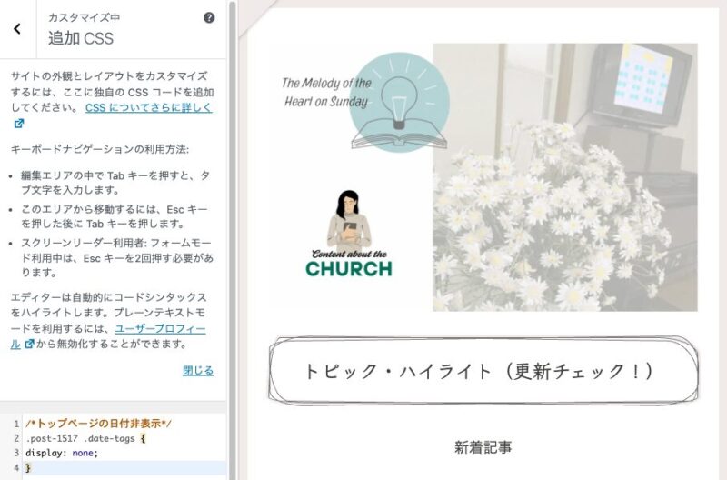 まずはトップページのIDを調べ、外観カスタマイズの追加CSSに以下のコードを設定。すると……トップページから投稿日と更新日が消えてくれました!